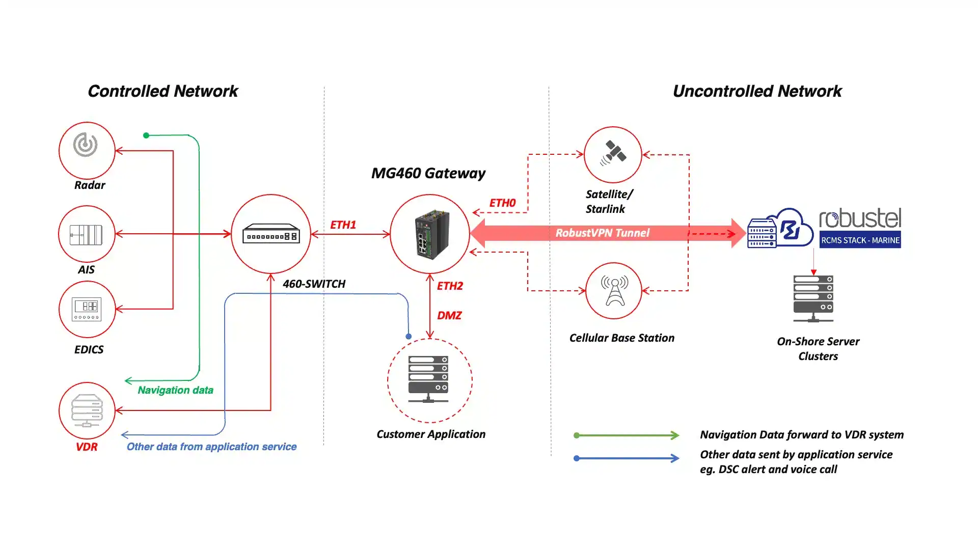 - Compliant gateway foundation: Deploy MG Core on MG460 Gateway to enforce segmentation, least-privilege access, services-off-by-default, signed updates, and clear logging—supporting IACS UR E26/E27 cyber objectives and IEC 61162-460 network design principles.
