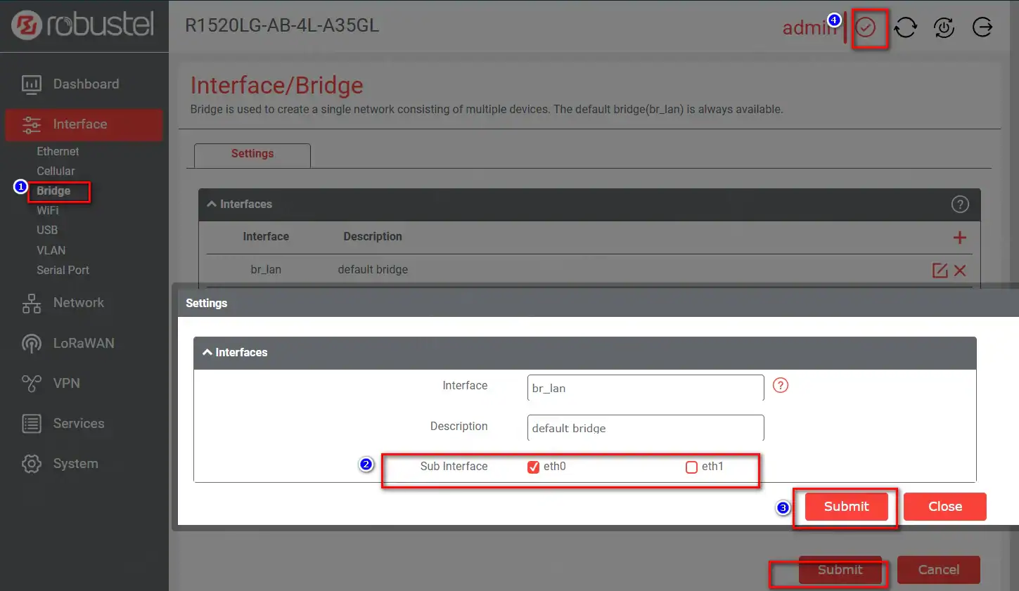 1. Access the R1520LG Web Interface and navigate to Bridge → Settings.