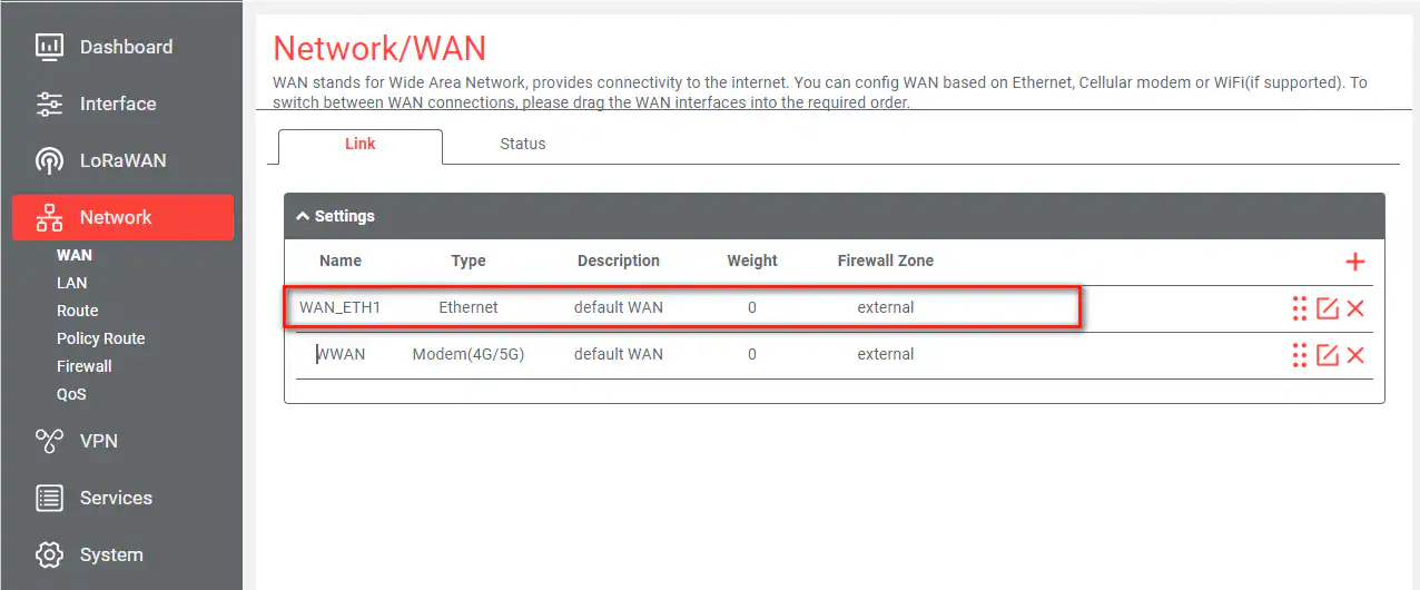 3. Go to Network → WAN → Link and add a new link for cellular dial-up, selecting “Modem” as the link type.