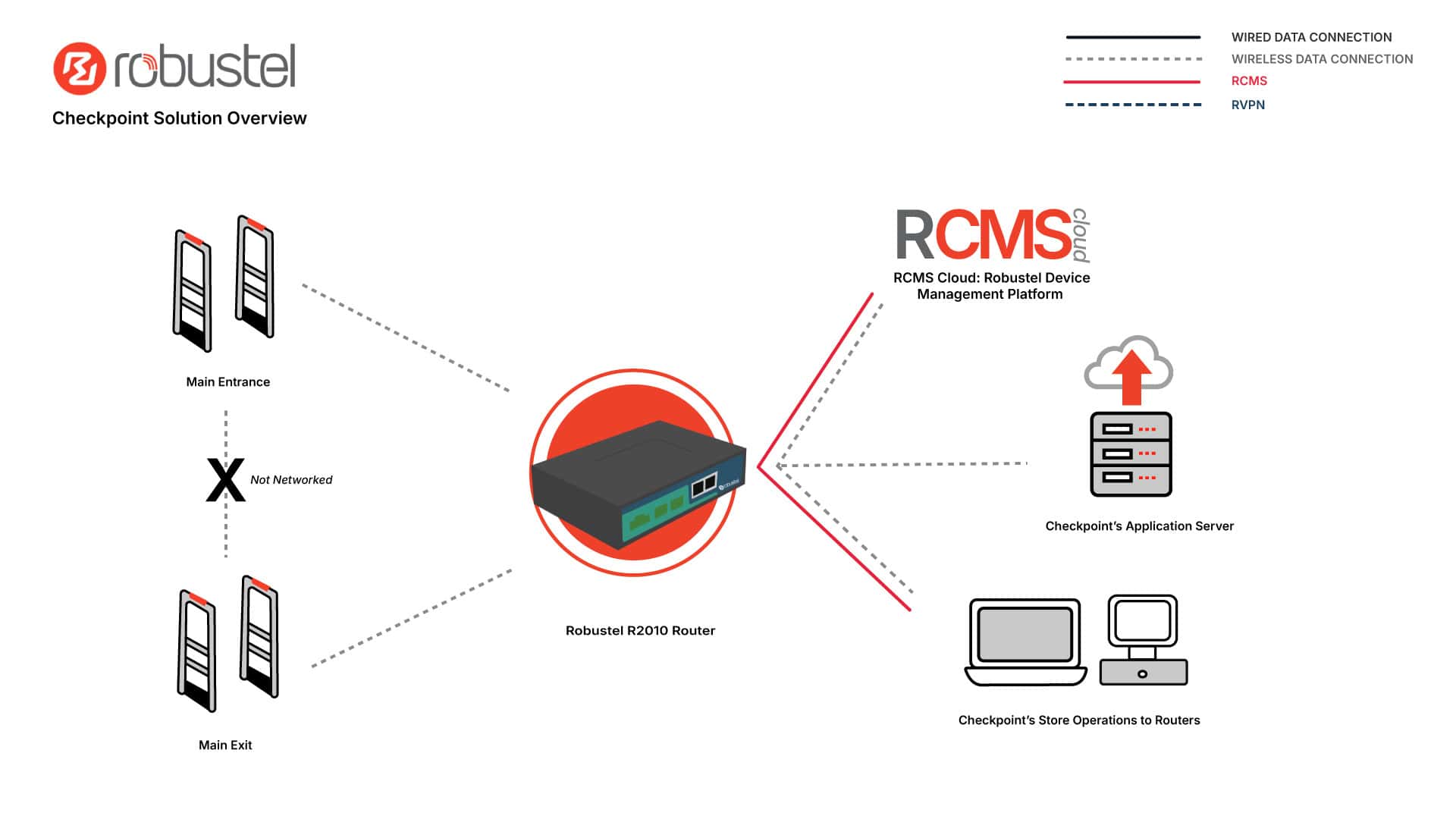 Checkpoint’s EAS pedestals ship with an Ethernet interface, which is used in this project to connect each gate to an industrial LTE router now represented by the Robustel R2010. The router hosts a SIM capable of roaming between AT&T and T-Mobile in the United States, giving each store access to two nationwide networks instead of one. Application and telemetry traffic from the pedestals flows through the router to Checkpoint’s cloud environment, where software aggregates device health, alarm events, and footfall data into dashboards for store operations teams. The diagram on page 2 of the original case study shows this topology, with pedestals at each store edge, routers providing backhaul, and central application servers and operations centres consuming the data.