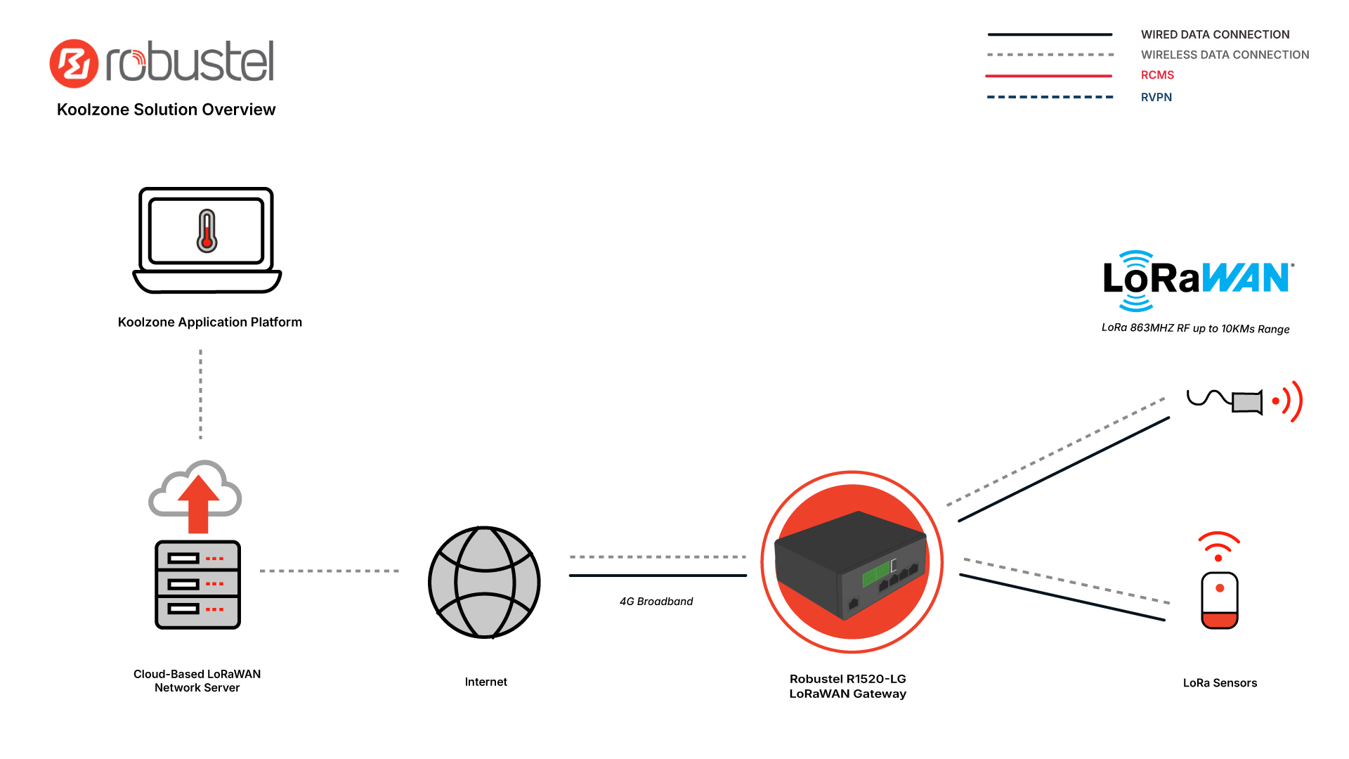 KoolZone delivers this through a LoRaWAN-based sensing platform and a managed cloud service. The Robustel R1520-LG sits at the edge to bridge on-site sensors to the internet, while RCMS gives engineering teams the ability to monitor, configure, and maintain the deployed gateways from anywhere.
