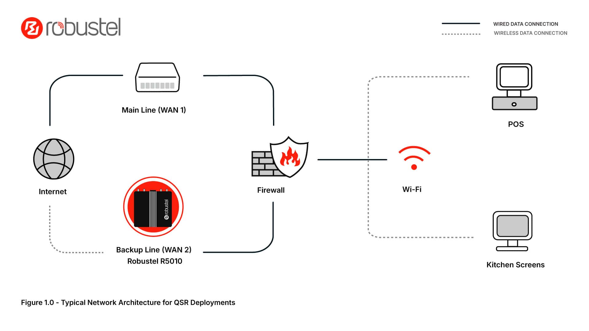 Deploying Robustel R5010 5G routers with external enclosures for stronger signal, site-specific unlimited data SIMs, and SD-WAN dual-WAN—delivered zero-day connectivity and seamless automatic failover for POS, kiosks, kitchen displays and guest Wi-Fi. Zero-touch rollout via RCMS accelerated store readiness, improved uptime, reduced support overhead, and enabled a repeatable, scalable template across the QSR estate.