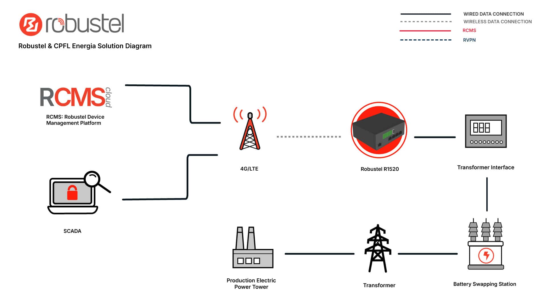 CPFL Energia chose to simplify its cabinet design by using the Robustel R1520 as the central communications node at each location. The router provides secure 4G/LTE backhaul, VPN termination, and time synchronisation functions in a single device, connecting field automation equipment to control systems over public cellular networks. Fleet-wide monitoring and configuration are handled through RCMS, giving engineers a single pane of glass for deployed routers.
