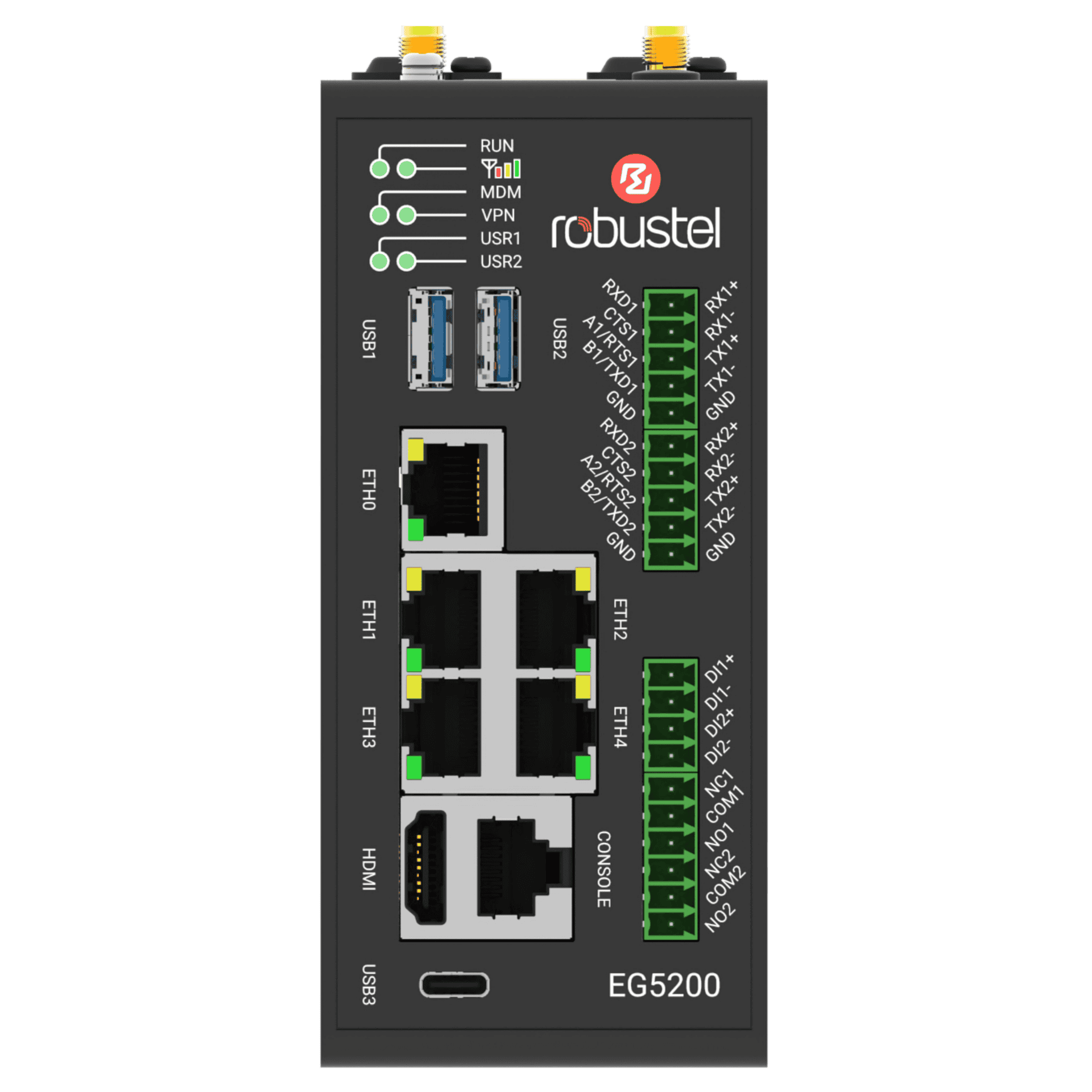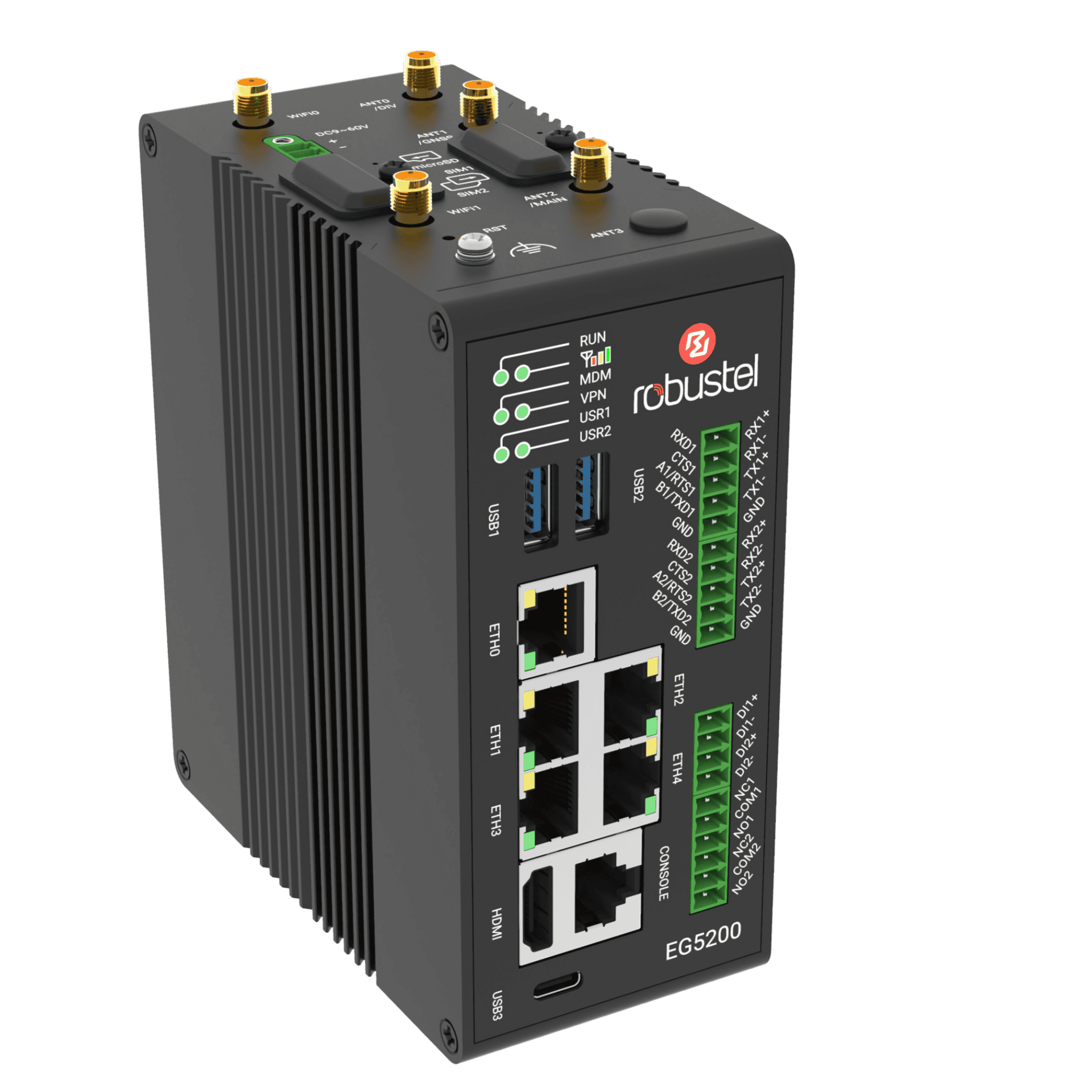 The Robustel EG5200 is an industrial edge computing gateway that combines secure cellular backhaul with on-box processing in a cabinet-ready form factor. Built on RobustOS Pro (Debian 11), it supports Docker containers and Debian packages so you can run protocol bridges, buffering, and analytics at the edge alongside your equipment.