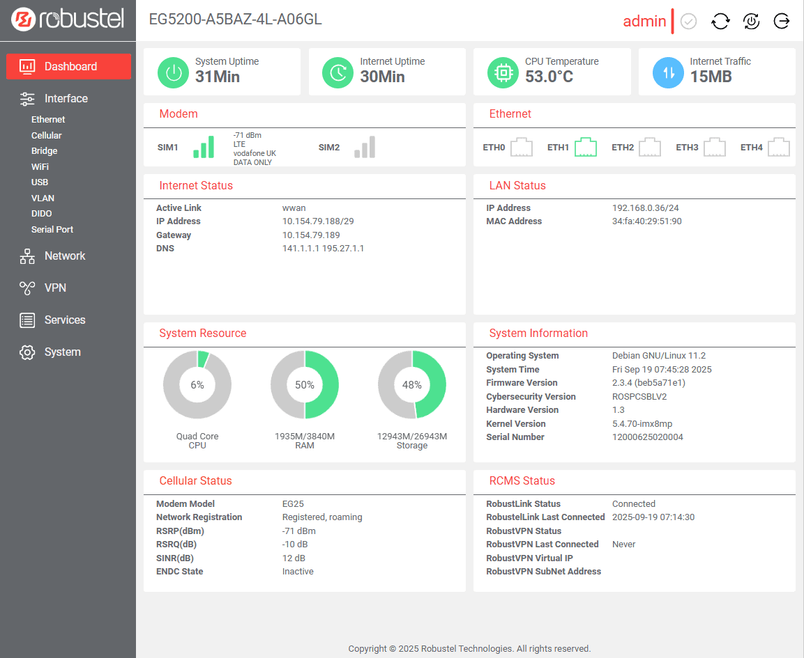 RobustOS Pro and the Robustel Edge Gateway are designed as one platform. Industrial hardware with router-grade networking, plus a full Debian environment for your applications. The value comes from the two working together: the OS gives you developer freedom and governance; the gateway gives you resilient power, I/O, and links you can trust in the field.