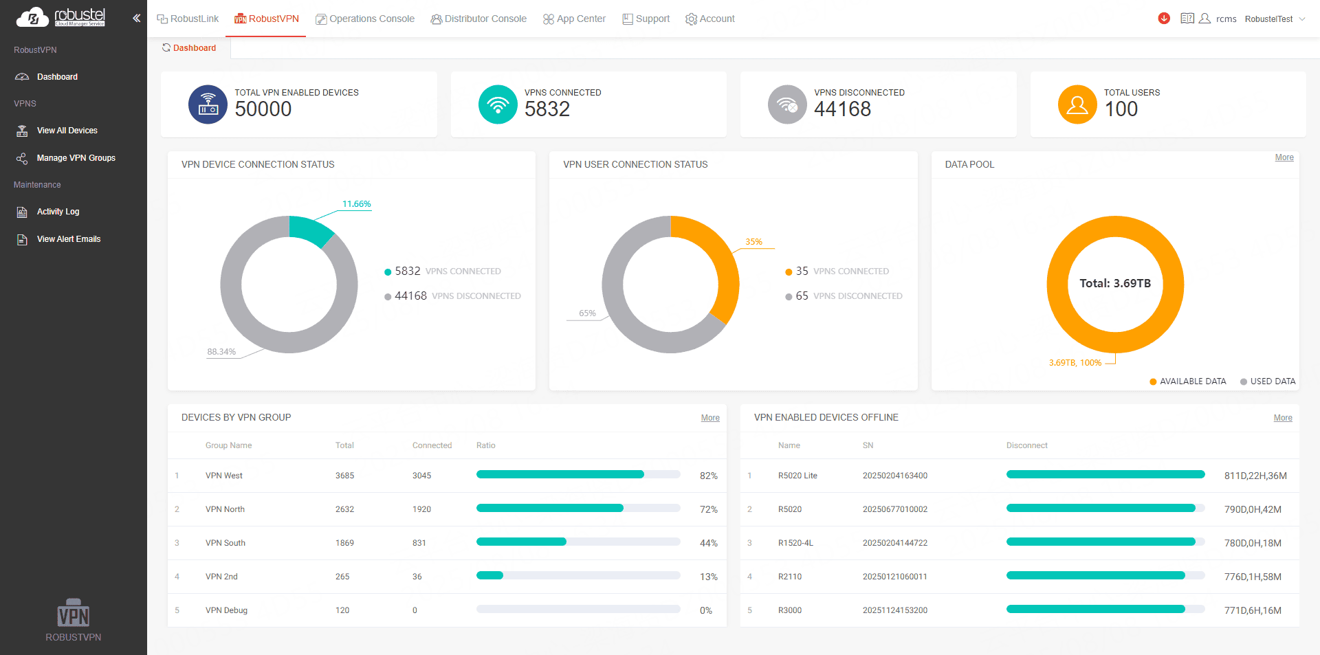 RobustVPN is an OpenVPN-based overlay that gives every enrolled Robustel gateway a fixed private IP and places devices and users on the same virtual LAN, regardless of carrier or access type. Gateways run a lightweight RobustVPN app; users connect with a desktop client; RCMS handles group policy, enrollment, and visibility. Because sessions originate outbound from the site, it works cleanly behind NAT/CGNAT and without fixed-IP SIMs, port forwards, or bespoke ISP configs. The result is a consistent addressing and access model you can standardize across fleets.